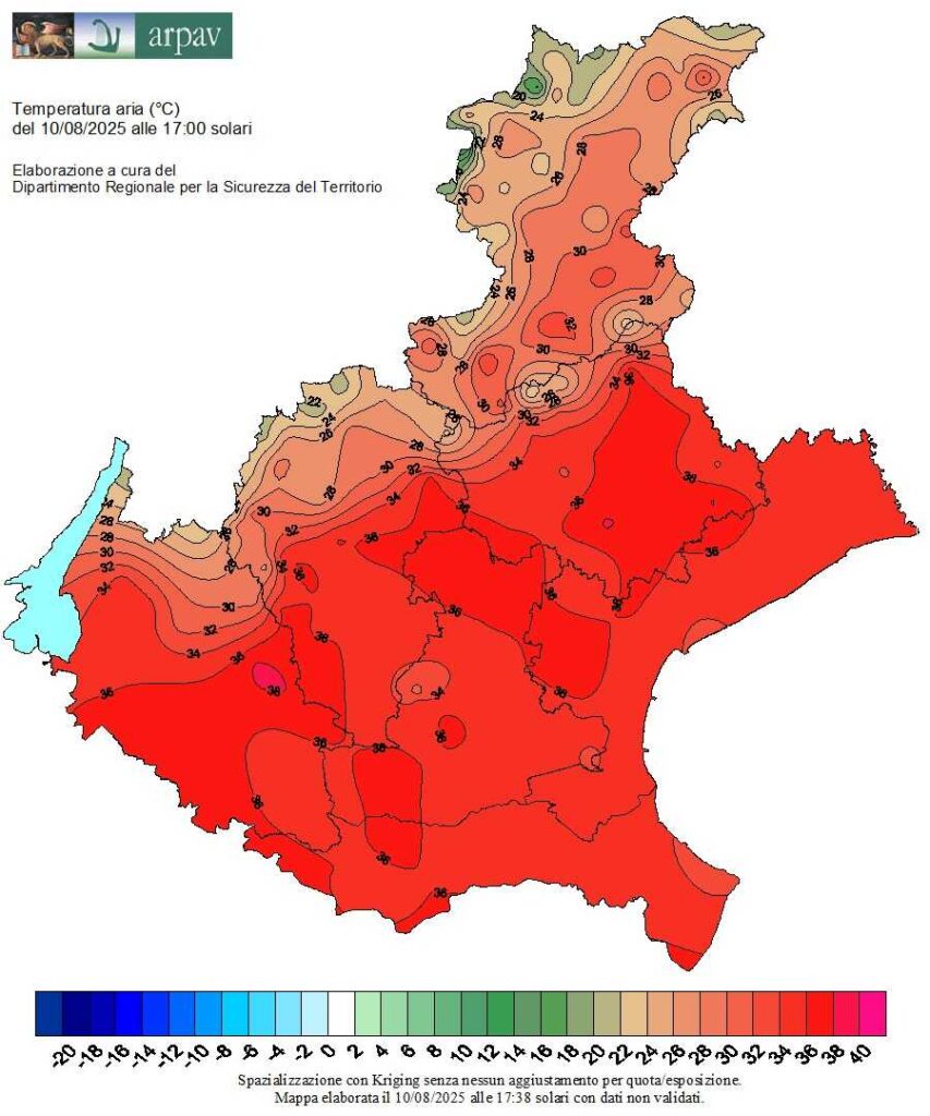 Quanto caldo ha fatto Domenica 10 agosto? Come previsto è stato raggiunto il picco dell’ondata di calore sul Nord Italia e in particolare sul Nord Est. Emblematica le linee delle isoterme sul Veneto, alle ore 17:00 del 10 agosto 2025, con 36° C. ampiamente diffusi su tutta la pianura.