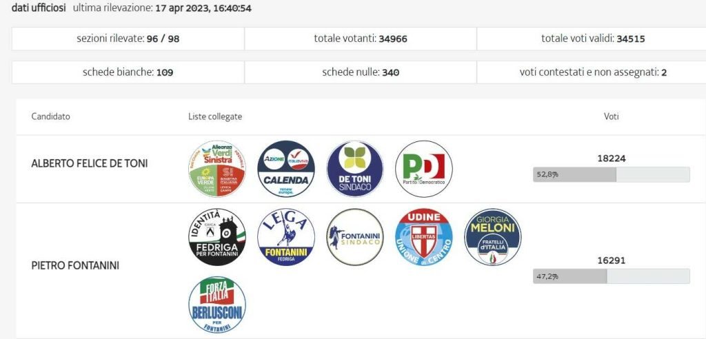 Al ballottaggio ha recuperato il divario che lo separava dal sindaco uscente, Pietro Fontanini che al primo turno aveva raccolto il 46,25% dei voti mentre lo sfidante si era fermato al 39,7%.