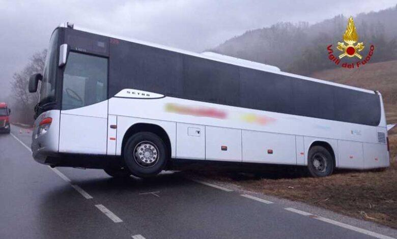 I pompieri accorsi da Belluno e con i volontari dell’Alpago con tre automezzi, tra cui l’autogrù, hanno imbragato e rimesso in strada la corriera.