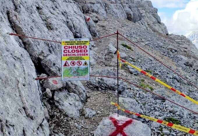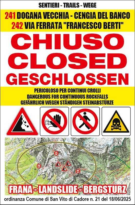 A seguito dei recenti interventi per recuperare tre persone bloccate dalle scariche di sassi e delle continue segnalazioni di ulteriori passaggi di escursionisti, malgrado la chiusura della Ferrata Berti dovuta alla frana sulla Croda Marcora, in mattinata sono stati serrati i due accessi al sentiero 242, sia da Cortina che da San Vito di Cadore.