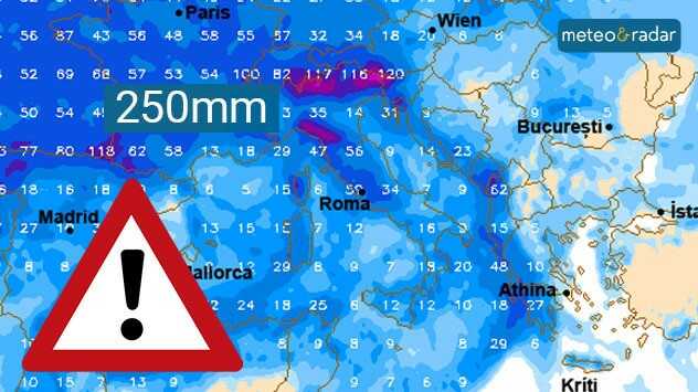 Meteo&Radar ha tracciato una mappa di previsione che mostra picchi fino a 250 mm di pioggia entro lunedì 26 febbraio.