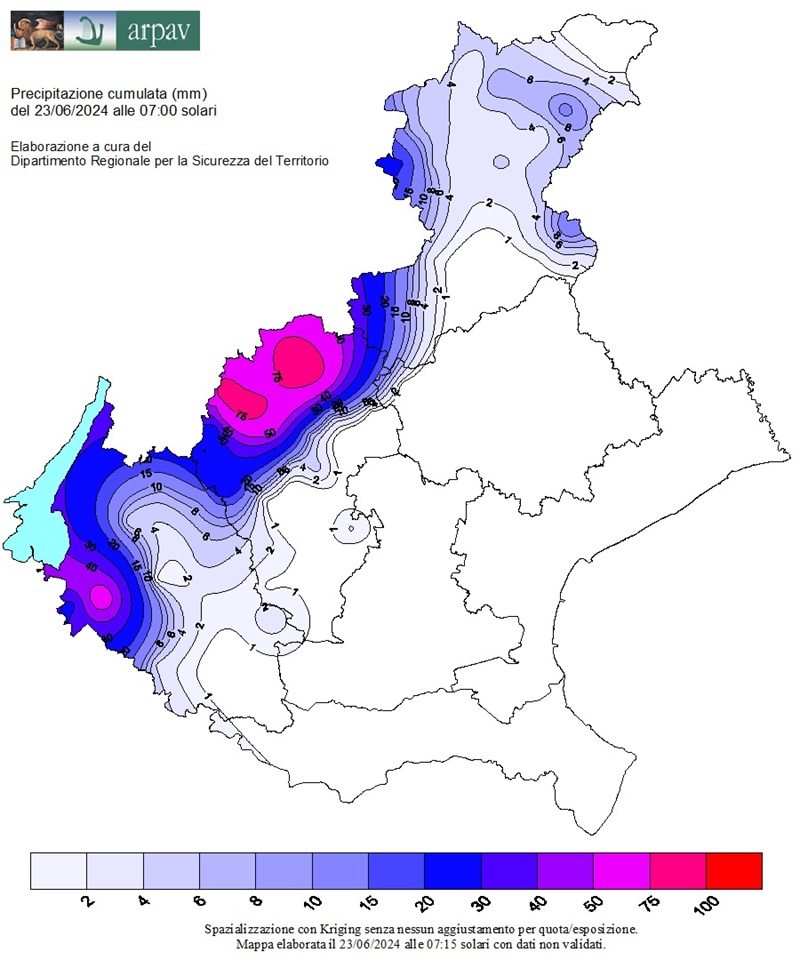 Forti temporali si sono abbattuti tra la serata di sabato e le prime ore di domenica lungo la linea della Pedemontana e Prealpi a causa di un minimo depressionario che si è formato sul Tirreno e favorisce episodi di pioggia battente sui rilievi del Triveneto.