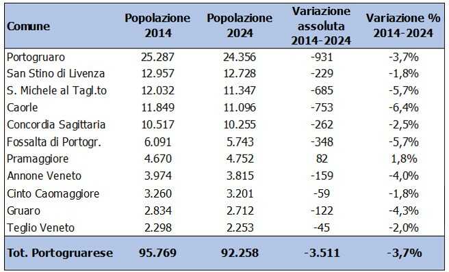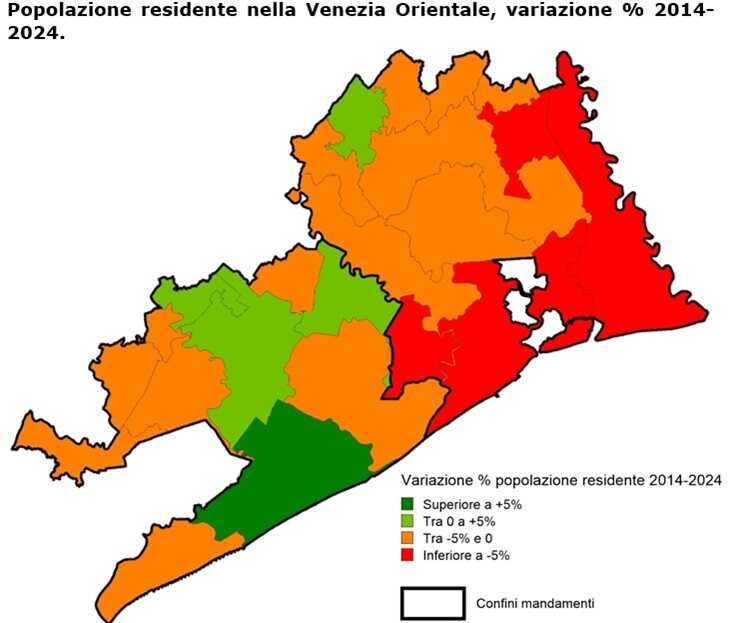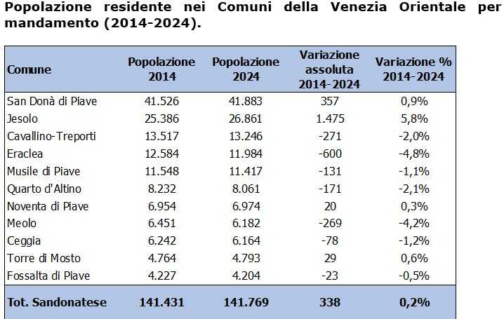 Secondo l’analisi della Fondazione, nella Venezia Orientale la popolazione ha raggiunto il valore massimo nel 2014, con 237.200 abitanti: nel decennio successivo è iniziato il calo (-1,3% tra 2014 e 2024), determinato dal trend negativo del Portogruarese (-3,7%), mentre nel Sandonatese l’andamento è stabile (+0,2%).