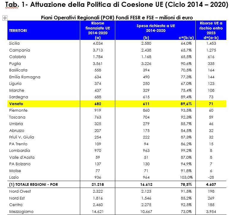 Entro la fine di quest’anno il Veneto deve ancora spendere 71 milioni di euro di Fondi di coesione europea, altrimenti corriamo il rischio di perderli.