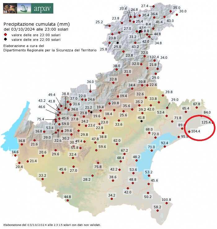 L’ondata di maltempo ha portato piogge intense sul basso Veneto e lungo la costa dove le centraline dell’Arpav hanno registrato i quantitativi maggiori durante la giornata di giovedi 3 ottobre: 104 mm ad Eraclea e 125 mm a Bibione.