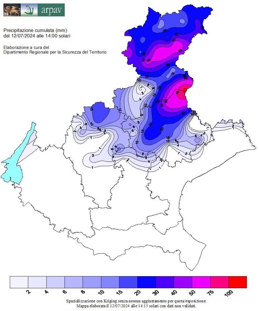 Nella mappa dell’Arpav sono ben delineate le aree con le precipitazioni cumulate. Sia nella vallate feltrine, sia sulla pedemontana trevigiana come sull’altopiano di Asiago, ci sono stati episodi di grandine, fortunatamente di piccole dimensioni, a macchia di leopardo e poco fitta.