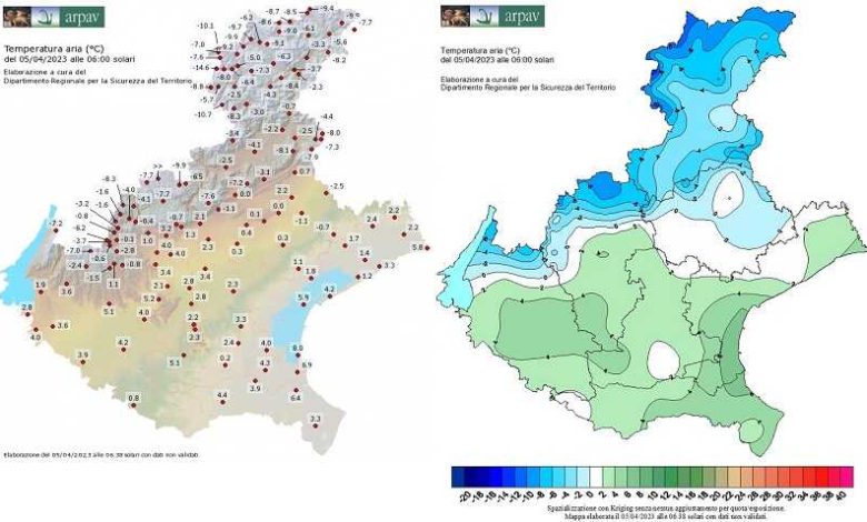 locali gelate anche in pianura in particolare la Sinistra Piave trevigiana dove le centraline dell’Arpav hanno rilevato le minime di -2,5 a Gaiarine, – 1,5 a Tezze di Vazzola e -1,4 a Ponte di Piave.