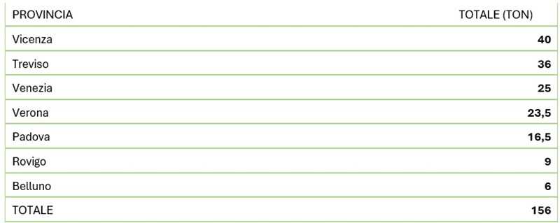 Seguono Treviso con 36 tonnellate, Venezia (25), Verona (23,5), Padova (16,5), Rovigo (9) e Belluno (6).