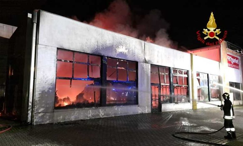 L’incendio ha coinvolto un market di abbigliamento, casalinghi e piccoli elettrodomestici e diverse altre attività presenti nello stesso stabile di proprietà di una società del veneziano.
