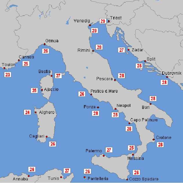 La temperatura del mare al largo delle coste venete e friulane, raggiunge quasi i 30° C