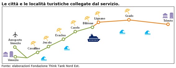 “Oggi i collegamenti via mare tra le spiagge della Venezia Orientale sono praticamente assenti – precisa Antonio Ferrarelli, presidente della Fondazione Think Tank Nord Est – e quelli con Venezia vengono offerti solamente come escursione giornaliera. Lo sviluppo dei collegamenti attraverso l’Adriatico tra Cavallino, Jesolo, Eraclea, Caorle e Bibione, arrivando fino al centro storico di Venezia e all’aeroporto con un unico servizio integrato, contribuirebbe ad aumentare la competitività turistica di tutto il litorale.