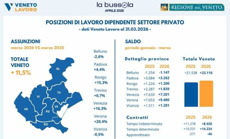 Per il mercato del lavoro in Veneto il saldo del primo trimestre del 2026 è positivo, con +23.100 posizioni, e più favorevole di quello registrato nel 2025 (+21.500) grazie ai risultati osservati a marzo.
