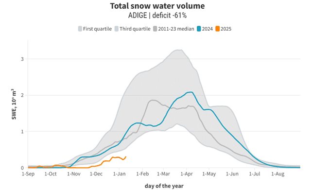 Dicembre ha registrato ancora una scarsa quantità di neve, con i principali bacini fluviali, significativamente sotto la media, come conferma l’Arpav che ha segnalato come il mese di novembre 2024 sia stato il mese più siccitoso dell’anno.