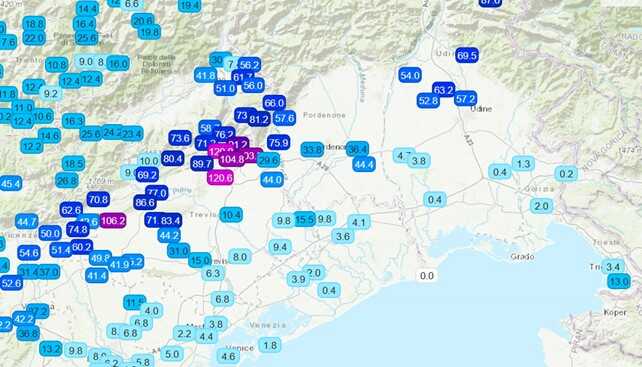 Riassunto totale precipitazioni 7/7 – 120 mm nel coneglianese, poco più di 50mm tra pordenonese e udinese