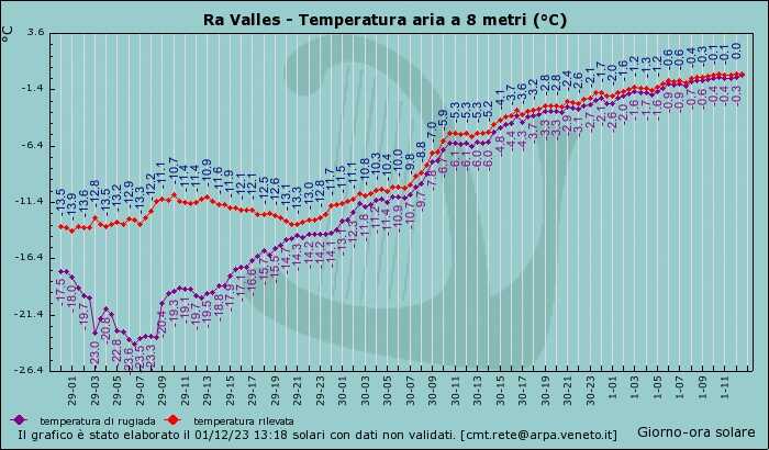 Dalle temperature rilevate in tempo reale (vedi Ra Valles – Tofana oltre 2.500 mt) si nota chiaramente l’azione del richiamo mite ed umido che sta interessando anche l’arco alpino nord orientale.