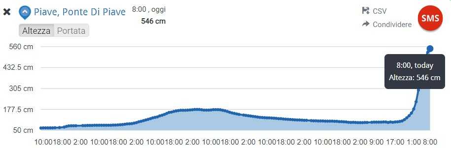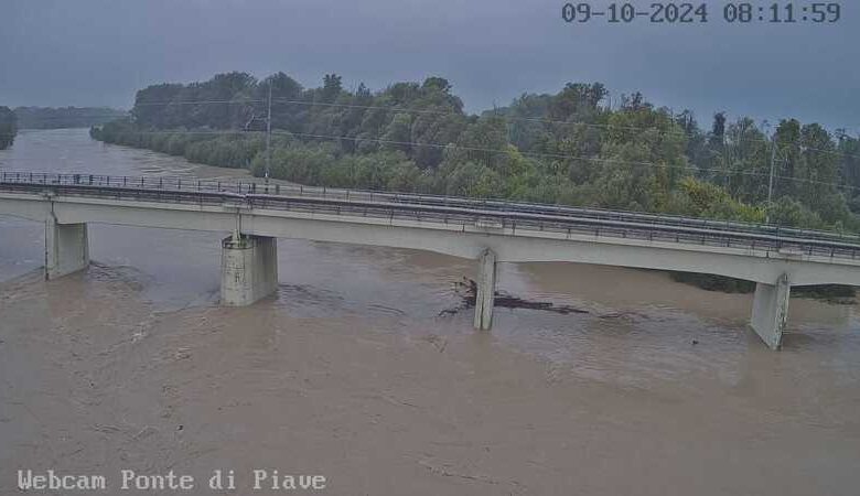 La piena del Piave ha già raggiunto la pianura trevigiana. I livelli sono in calo a Nervesa ma ancora in crescita di 20 cm/h a Ponte di Piave dove alle 8:00 ha toccato i 5,46 mt e l’area golenale risulta allagata. Alla traversa di Busche, nella notte, la portata del fiume era di circa 750 m³/s;. Il ponte di barche a Fossalta di Piave è stato rimosso, così come quello che collega la località di Revedoli di Eraclea a Cortellazzo.