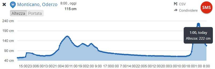 Monticano: il colmo di piena è transitato all’idrometro posizionato nei pressi della Piazza all’1:00 di notte a quota 2,22 mt, con livelli di poco inferiori alla seconda soglia di allertamento;