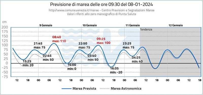 In particolare, martedì 09 gennaio, è prevista una massima di 110cm alle ore 08:40.