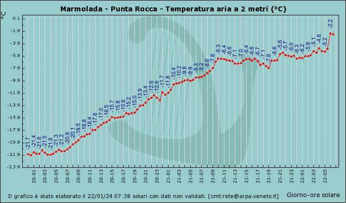 Man mano che ci si alza in quota le temperature stanno progressivamente salendo, interessante il grafico della centralina posizionato a Punta Rocca sulla Marmolada dove el giro di 48 ore le temperature sono salite di 20 gradi.