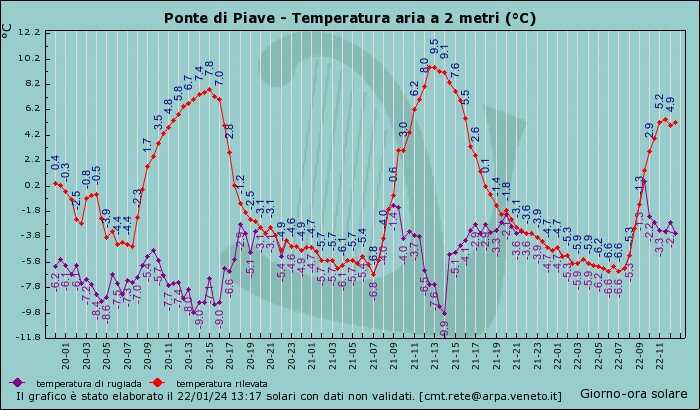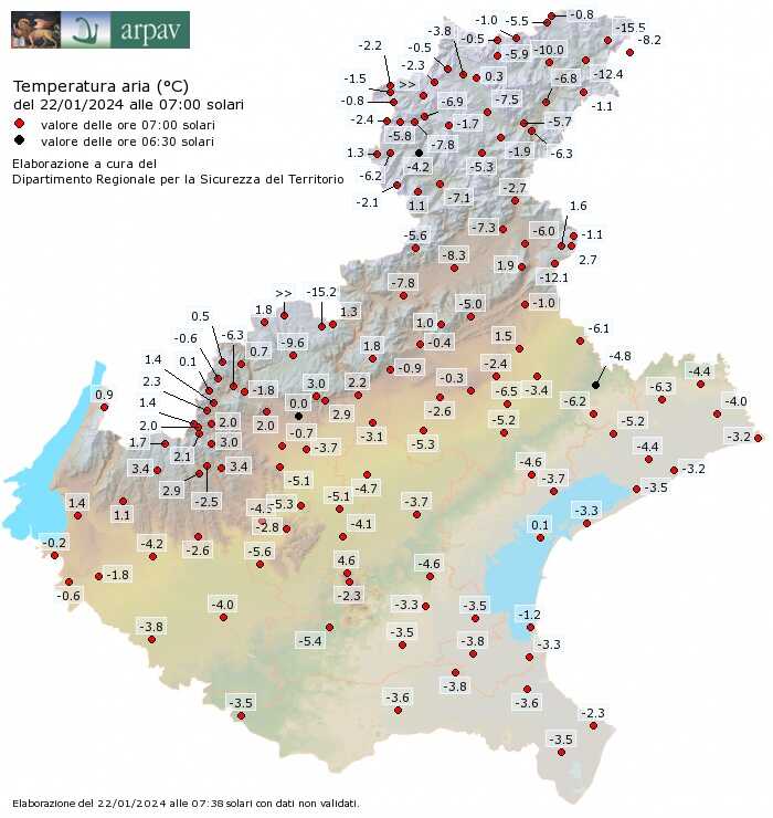 I minimi in pianura sono stati inferiori di parecchie località di fondovalle alpini, ad eccezione di Auronzo -10 e Santo Stefano -12.