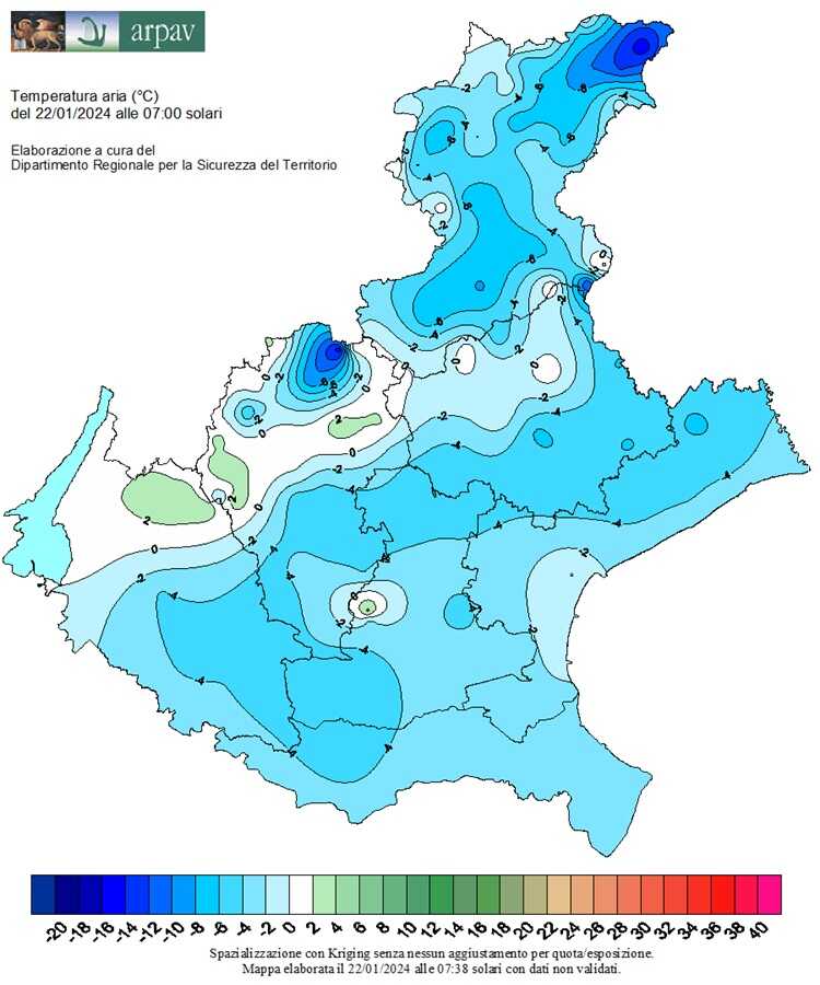 Questa mattina il risveglio in pianura è stato da brividi, in particolare nella parte orientale del Veneto. Ben tre centraline dell’Arpav hanno registrato alle 6:30 di stamane temperature sotto i 6 gradi: Villorba con -6,5°, Ponte di Piave -6,6° e Portogruaro -6,3°. Abbondantemente sotto i -3° anche le spiagge dell’Alto Adriatico.
