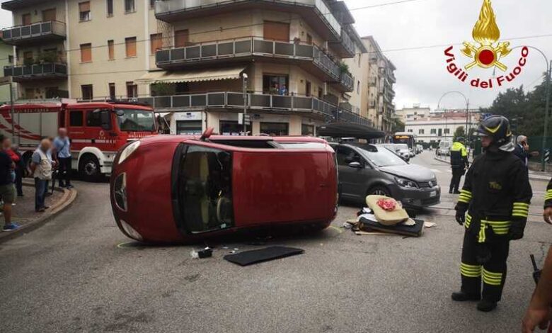 A causa dell’urto laterale, una delle vetture è finita rovesciata su un fianco.