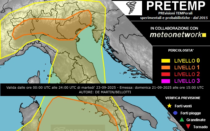 Tra la mattinata di domani martedì 23 e il pomeriggio di mercoledì 24 settembre il Veneto sarà interessato da varie fasi di tempo instabile/perturbato con frequenti precipitazioni a prevalente carattere di rovescio e temporale, specie tra Prealpi e pianura dove saranno possibili fenomeni localmente intensi con quantitativi anche abbondanti specie sui settori centro-orientali.