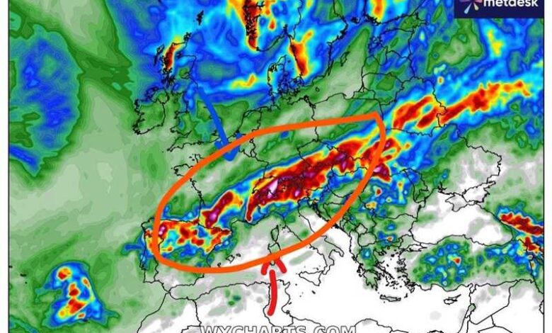 Tra domenica e lunedì si andrà a delineare una situazione potenzialmente estrema a livello precipitativo sull’Europa centrale, Nord Italia compreso.