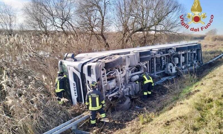 Un autoarticolato mentre percorreva SP43 tra Portegrandi e Caposile in località Ca’ Redenta, in comune di Quarto d’Altino, è fuoriuscito dalla sede stradale, ha divelto il guardrail e si è adagiato di fianco quasi a sfiorare le acque della laguna di Venezia.