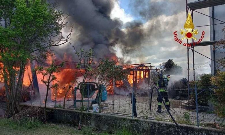 Le fiamme hanno avvolto una struttura di lamiera di circa 200 mq adibita a legnaia, ricovero mezzi da giardinaggio e deposito.