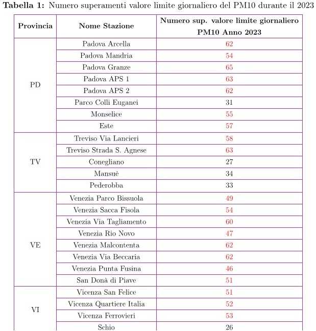 Secondo il rapporto Arpav, rimane ancora diffuso invece il superamento del valore limite giornaliero per il PM10, fissato a 50 microgrammi per metro cubo, da non sforare per più di 35 giorni l’anno: nel 2023 è stato rispettato in 11 centraline su 38, un dato comunque in miglioramento rispetto alle 8 stazioni sotto il limite del 2022. (vedi Tabella 1)