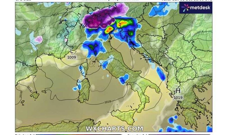 La pressione è in calo per l’avvicinamento da nord-ovest di un sistema frontale perturbato che transiterà sul Nord Italia nella notte del 31 dicembre apportando maltempo.