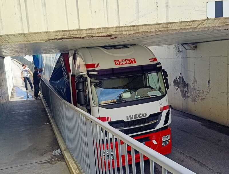 Strada interrotta ad Oderzo per un autoarticolato, con targa italiana e autista senegalese, che è finito incastrato nel sottopasso di via Spinè. La Sp54 è rimasta interrotta dalle ore 15 sino alle 16:30, a causa dell’autista del bilico che non si è avveduto dei 3,30 mt di limite di sagoma e ci si è infilato dentro con il mezzo, subendo notevoli danni al semirimorchio, alla centinatura e alla cabina della motrice.