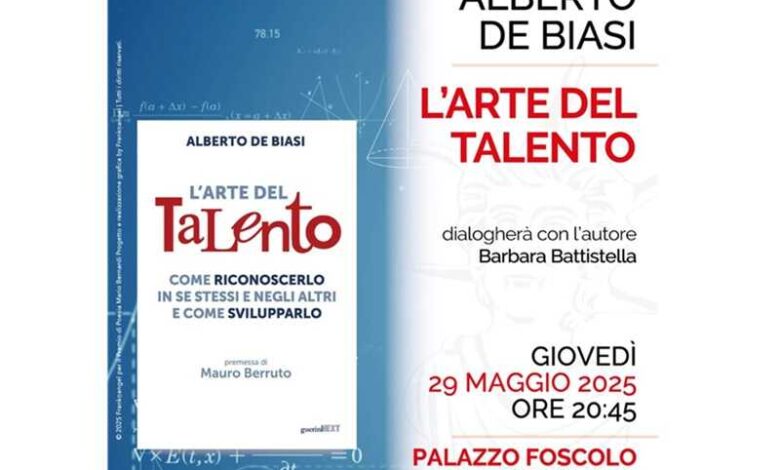 A Palazzo Foscolo di Oderzo, giovedì sera va in scena la presentazione del saggio “L’Arte del Talento come riconoscerlo in se stessi e negli altri e come svilupparlo”, di Alberto De Biasi, in dialogo con la giornalista Barbara Battistella.
