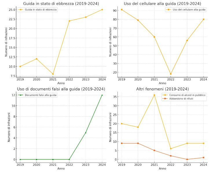 - 10 violazioni accertate nel 2019 a 25 nel 2024, dimostra una maggiore capacità operativa sulle strade;