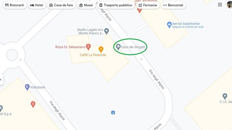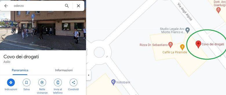 Qualche buontempone ha pensato di rivendicare la schedina di Google lasciata vacante da Veneto Banca, dopo la chiusura della filiale di via degli Alpini 12, e l’ha denominata “covo dei drogati”.