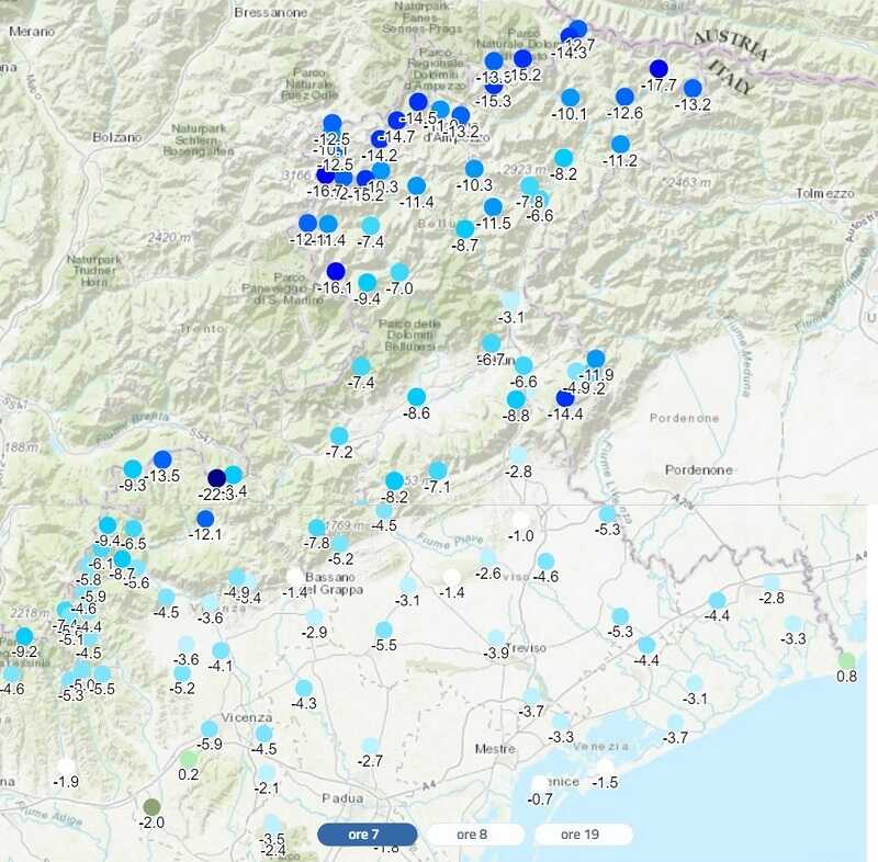 Ecco la mappa delle centraline Arpav in Veneto e le temperature rilevate alle ore 07:00