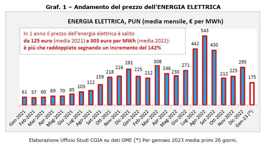 Nei primi 26 giorni del 2023 la media del prezzo dell’energia è scesa a 176 euro e quello del gas a 68 euro. Importi, quest’ultimi, comunque superiori rispettivamente del 190 e del 240% se comparati con quelli di inizio 2021.
