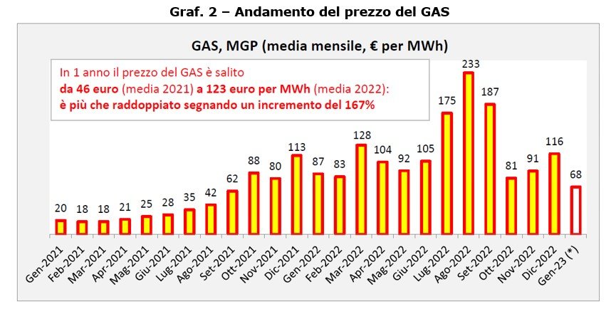 Se nel 2022 il prezzo dell’energia elettrica è più che raddoppiato (+142%), passando da 125 (media 2021) a 303 euro per MWh (media 2022), quello del gas, invece, è rincarato addirittura del 167%, salendo da 46 euro (media 2021) a 123 euro (media 2022).