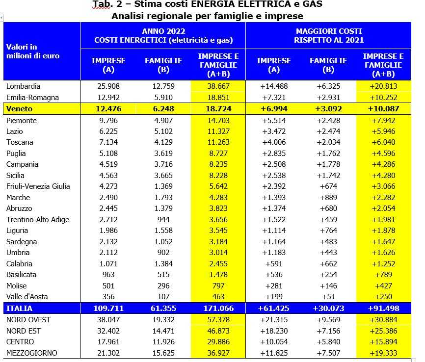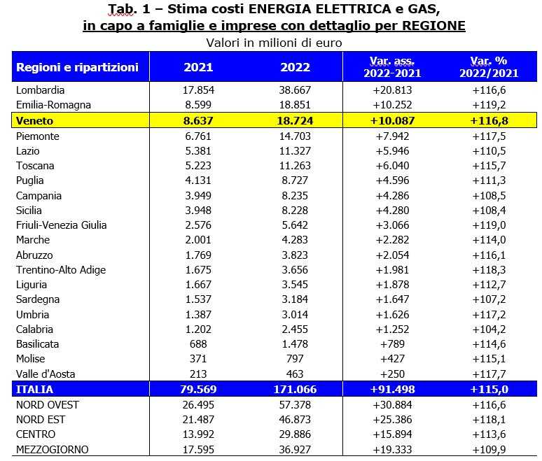 Tra le ripartizioni geografiche del Paese è il Nordest l’area più interessata dagli aumenti: rispetto al 2021 la stima degli extracosti per energia elettrica e gas è salita del 118,1%.