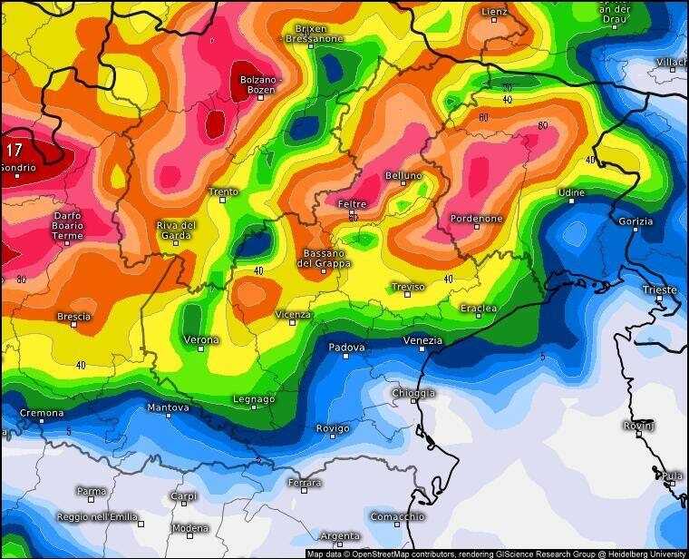 Venerdì la perturbazione proseguirà la corsa andando a interessare soprattutto il Nord-Est e la regione più colpita sarà il Friuli Venezia Giulia a causa di una risalita del fronte perturbato dal litorale veneto verso la Pedemontana friulana. E’ previsto un picco di precipitazioni tra Udine e Gorizia