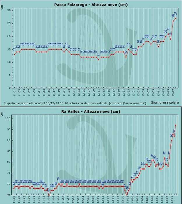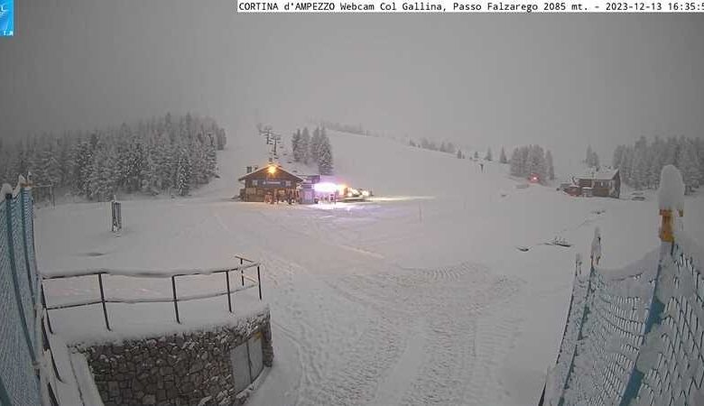Nelle ultime ore il limite si è leggermente abbassato e i fiocchi stanno cadendo attorno a quota 1.200 metri sulle Dolomiti.