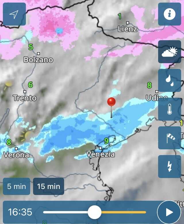Si stanno esaurendo gli effetti della modesta perturbazione transitata nella giornata odierna, in movimento da ovest verso est. Il suo arrivo è stato preannunciato con un rialzo delle temperature che ha portato la quota neve attorno ai 1400 metri sulle Dolomiti, 1800 sulle Prealpi.