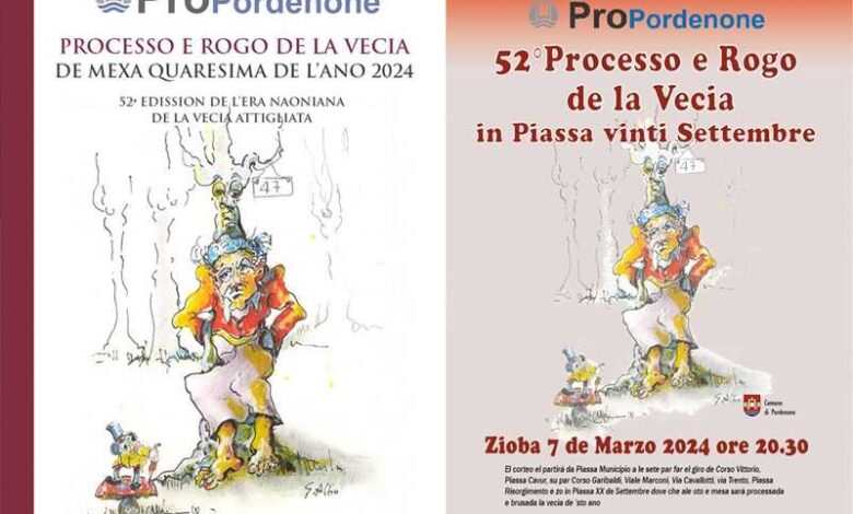 Il “Processo e rogo de la Vecia de mexa Quaresima” è uno degli eventi folkloristici più interessanti del Friuli Occidentale, diffuso in passato e ripreso dall’associazione Propordenone nel 1973. Si tratta di un processo a tutti gli effetti, recitato in dialetto pordenonese da diversi personaggi (tra cui accusa e difesa), nel quale la “Vecia” rappresenta il capro espiatorio su cui vanno addossati tutti i mali della comunità, che prende sulle sue spalle gli errori commessi dai personaggi pubblici cittadini durante l’anno trascorso. Con la pronuncia della sentenza di colpevolezza e la condanna al rogo, la rappresentazione assume un significato propiziatorio e di rinnovamento, per ripartire col sorriso e alleggeriti dalla pesantezza dell’anno passato.