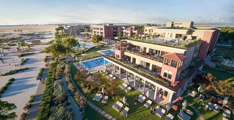 Il cuore dell’esperienza sarà una spiaggia privata di 5 ettari con cabanas immerse tra morbide dune rinverdite e un centro wellness di 4.000 m² con piscine riscaldate, saune, beauty farm e una rooftop spa adults-only con Infinity Sky Pool.