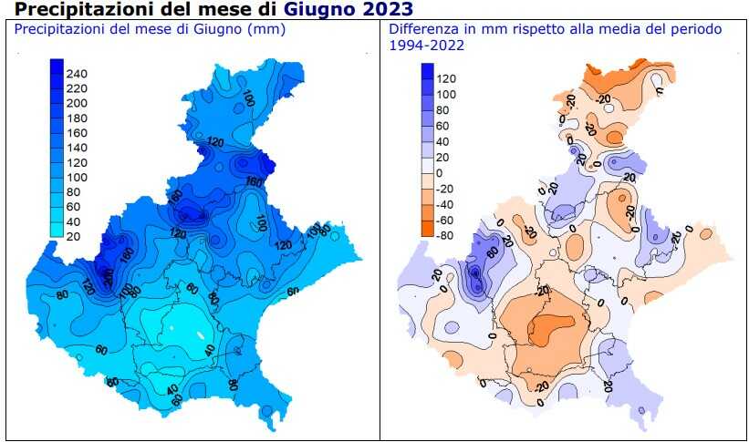 In giugno sono caduti mediamente in Veneto 98 millimetri di precipitazione; la media del periodo 1994-2022 è di 96 millimetri (mediana 98 mm). Gli apporti meteorici mensili sul territorio regionale sono di pochissimo superiori alla media (+2%) e sono stimabili in circa 1796 milioni di metri cubi di acqua.