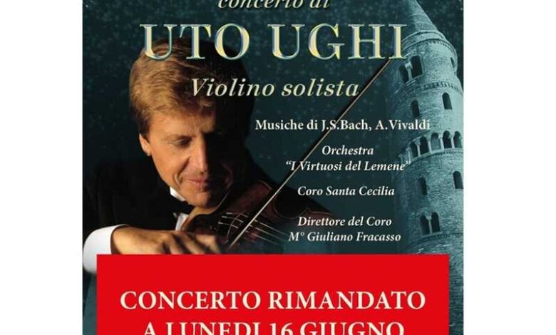 E’ stato rinviato a lunedì 16 giugno, sempre alle ore 21, nel Duomo di Caorle, il concerto con il celebre violinista Uto Ughi che si esibirà in concerto accompagnato dall’ Orchestra “I virtuosi del Lemene” e dal Coro Santa Cecilia – Musicultura Portogruaro, diretto dal Maestro Giuliano Fracasso.