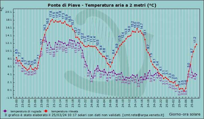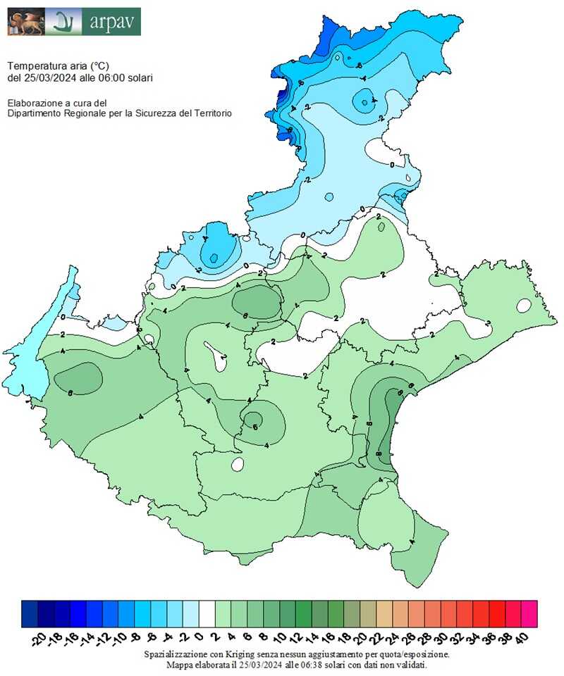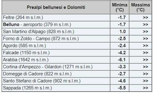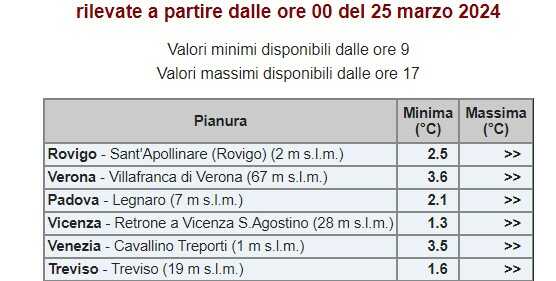 ma con punte anche più basse e prossime allo zero soprattutto nella parte più orientale della provincia (Ponte di Piave -0,5°) dove si riscontrano anche deboli gelate sui prati.