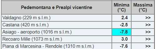 Secondo i dati raccolti dalle centraline dell’Arpav, è Asiago la località più fredda stamane con -7,8°. Sotto zero anche alcune località di fondo valle, area dolomitica, con Arabba -6, Sappada -5,5, Santo Stefano -4,6, Falcade -4,2
