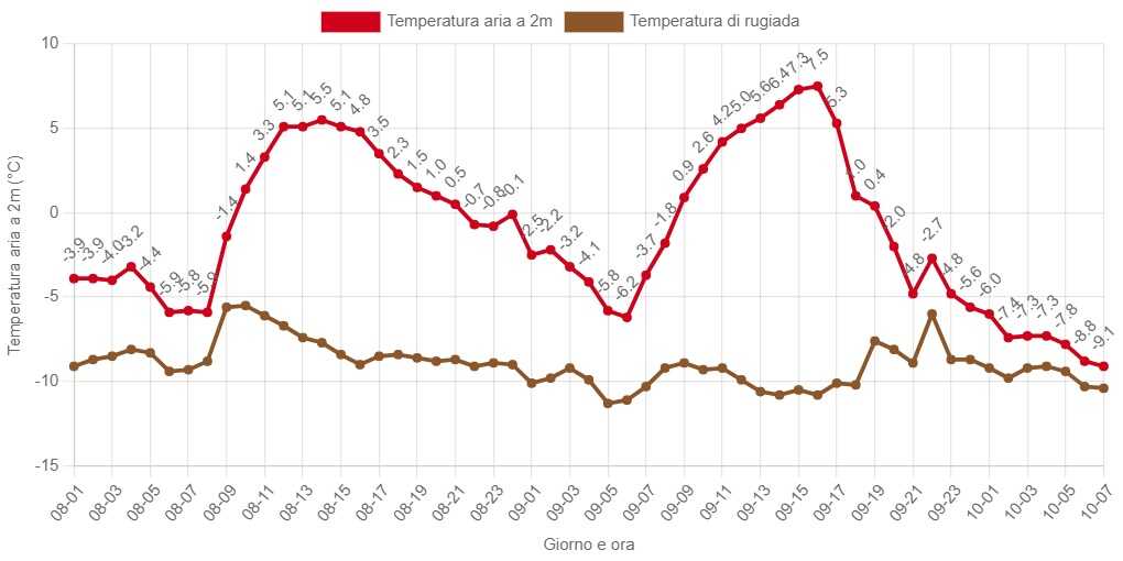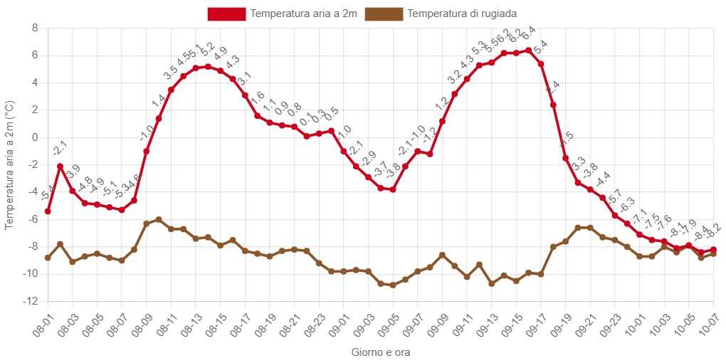 Si tratta di una delle mattinate più fredde dell’inverno, a causa del temporaneo ingresso di isoterme comprese tra i -9 e i 10°C alla quota di riferimento di 850hpa (1500m).